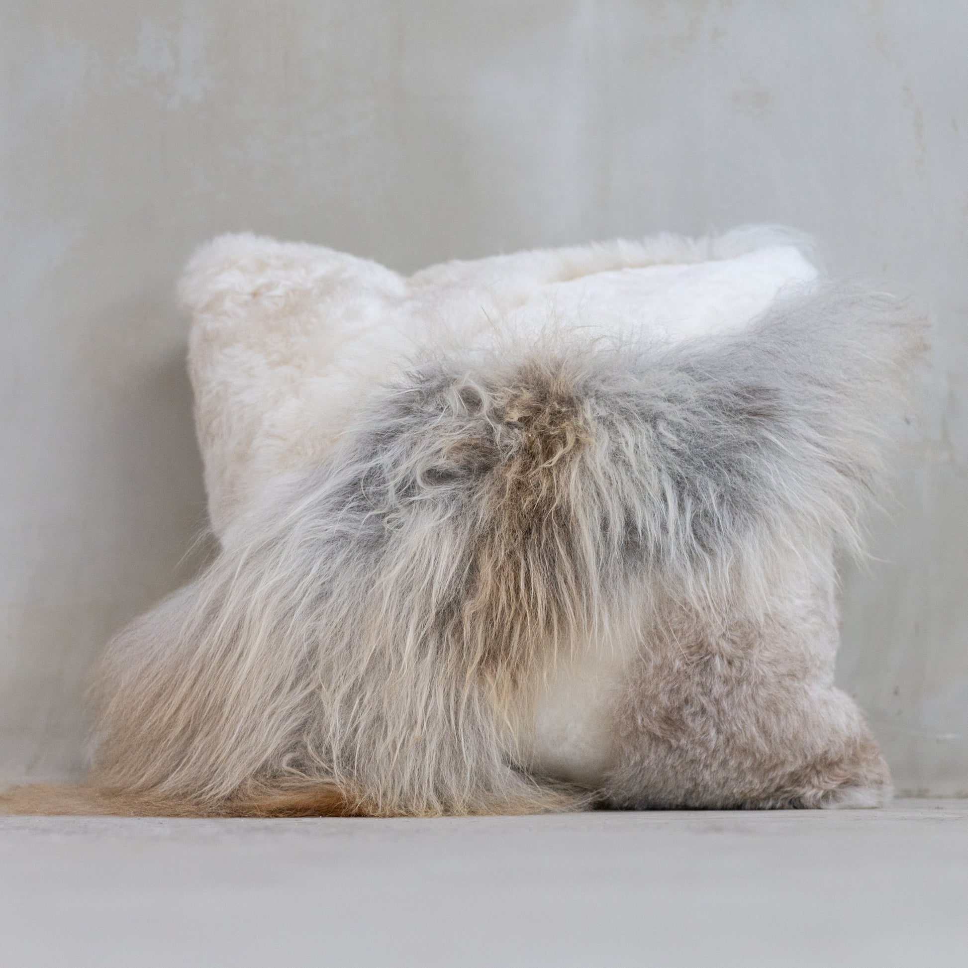 Deze unieke kussens zijn gemaakt van diverse soorten en kleuren schapenvacht. Ze hebben hetzelfde ontwerp als onze geliefde melange karpetten. De kussens zijn 50x50cm groot en worden geleverd inclusief kussenvulling, maar laat het ons weten als u ze liever zonder vulling heeft. De achterkant van de kussens is gemaakt van natuurlijk textiel.