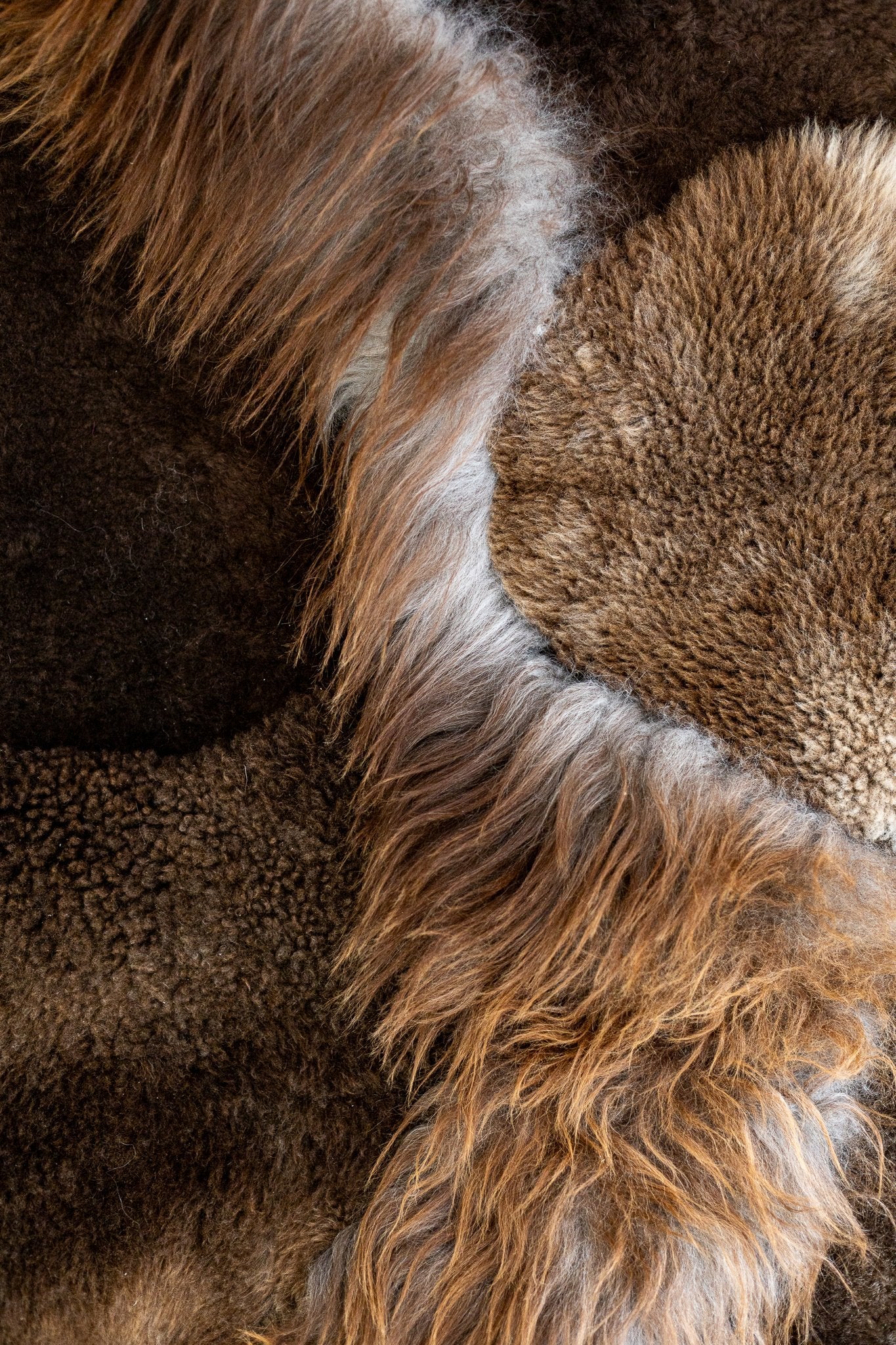 Een luxe tapijt gemaakt van een combinatie van langharige en geschoren bruine schapenvachten, samengevoegd tot een prachtig gemêleerd vloerkleed van ongeveer 120x180cm. Dit tapijt straalt warmte en stijl uit in elke ruimte.