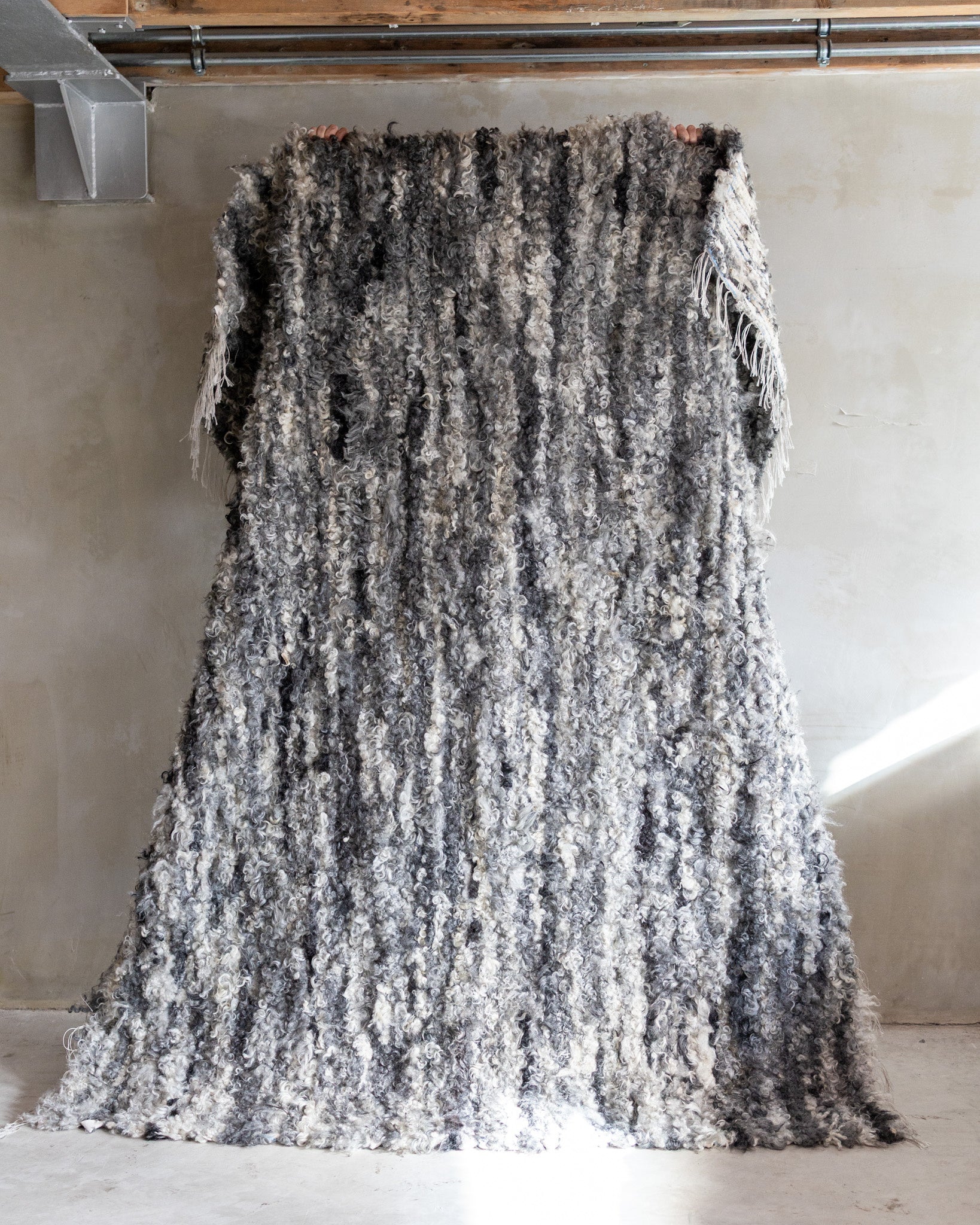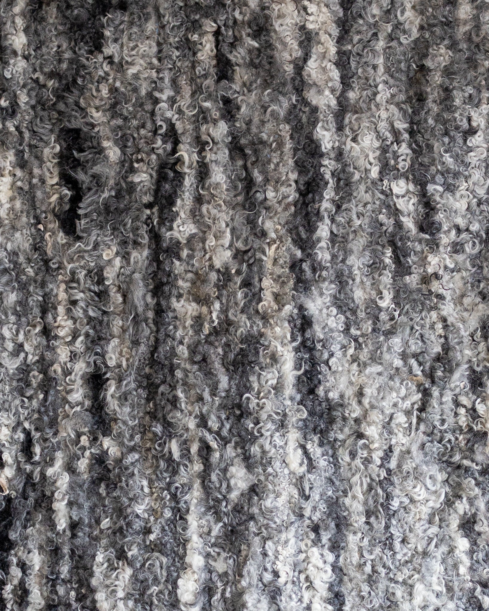 Een stevig geknoopt tapijt van schapenvacht. Dit tapijt is vervaardigd uit diverse natuurlijke grijze Gotland schapenvachten. We hebben specifiek dit tapijt apart gefotografeerd, dus je krijgt precies dat tapijt geleverd. We streven ernaar om zo natuurgetrouw mogelijk te fotograferen, maar er kan een klein kleurverschil zijn tussen het getoonde en geleverde product.