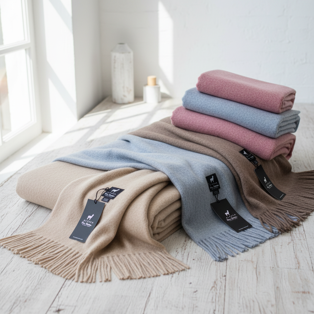 Een deken gemaakt van alpacawol, vergelijkbaar met kasjmier: zijdezacht, pluisvrij en met superfijne vezels. Verpakt in een prachtige kartonnen wikkel en verkrijgbaar in nieuwe kleuren zoals Okergeel en Mint. Elke verpakking bevat informatie over de herkomst, samenstelling en wasvoorschriften van de wol, evenals onze bedrijfsgegevens. De deken heeft ook een label met details over de alpacawol. Gemaakt van 50% alpacawol, 35% wol en 15% synthetisch materiaal, met afmetingen van 200x150 cm.